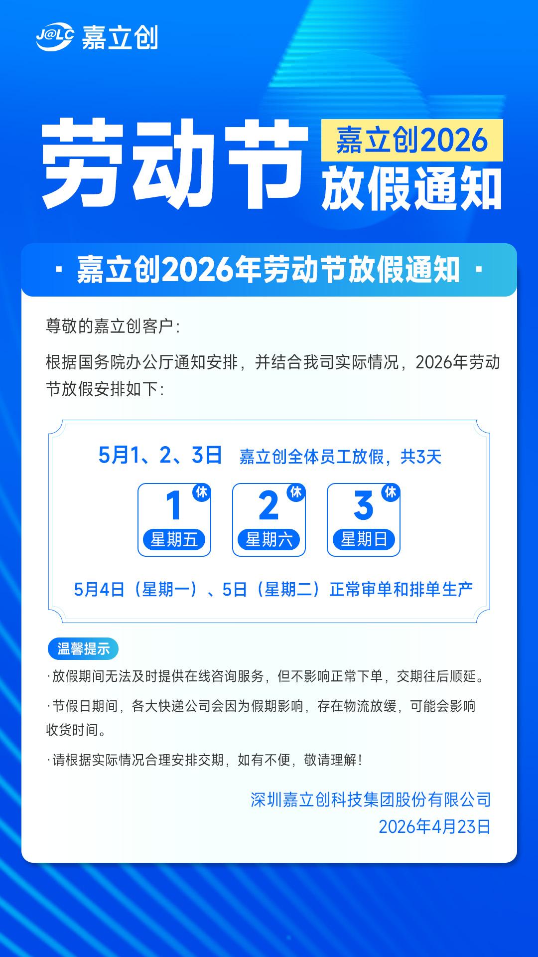 5月1日、2日和3日,嘉立创电热膜全体员工放假,共3天